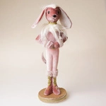 Pies z długimi uszami w różowym aksamitnym ubraniu