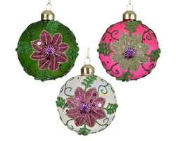 Bombka szklana 3sztuki 8cm zielony/opalizujący/róż brokatowe kwiaty transparentna 3wzory