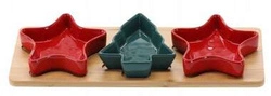 Komplet 3 sztuk miseczek ceramicznych czerwone gwiazdy i zielona choinka na drewnianej podstawce