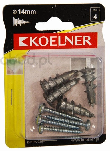 - Kołek wkręcany do gipsokartonu opakowanie 4 sztuki, Koelner średnica 14 mm z wkrętem
