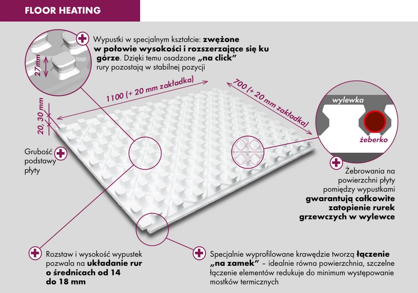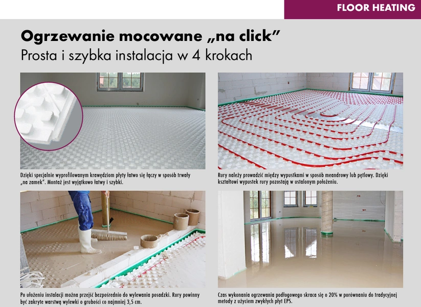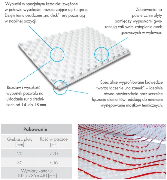 - Specjalne wypustki umożliwiają szybkie i łatwe układanie rur grzewczych – oszczędność czasu i pracy.