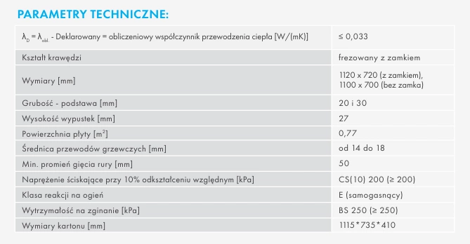 - Grubość całkowita 5,7 cm (3 cm styropianu + 2,7 cm grzybków) – optymalne parametry do ogrzewania podłogowego.