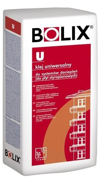 Klej Bolix U 25kg przeznaczony jest do przyklejania płyt styropianowych EPS, XPS oraz grafitowych, a także do zatapiania siatki z włókna szklanego podczas ocieplania ścian budynków mieszkalnych, użyteczności publicznej i przemysłowych w technologii bezspoinowego ocieplania. Sprawdza się także przy wyrównywaniu podłoży przed nałożeniem tynków cienkowarstwowych lub farb oraz w procesach termomodernizacji elewacji.