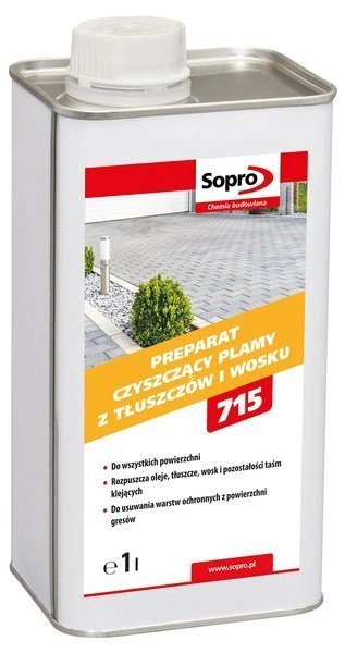 OWE 715 to środek służący do usuwania takich zanieczyszczeń jak wosk, olej, tłuszcz, smoła, bitumy, świeże farby, lakiery do drewna, powłoki lakierowane, utwardzone pozostałości środków do pielęgnacji kamienia itp. z odpornych na działanie rozpuszczalników podłoży jak powierzchnie betonowe, inne podłoża mineralne, płyty z kamienia naturalnego i betonu, płytki, płyty gliniane i klinkierowe itp. Również odpowiedni do usuwania pozostałości długotrwale elastycznych materiałów fugowych (fugi silikonowe).