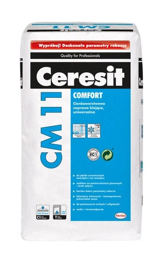 Klej CERESIT CM 11 jest zaprawą wodo i mrozoodporną, można ją stosować w pomieszczeniach suchych i wilgotnych. Na powierzchniach pionowych zachowuje konieczną stabilność, nie spływa. CERESIT CM 11 stanowi jednorodną masę, łatwą w mieszaniu i odznacza się bardzo dobrymi parametrami roboczymi.