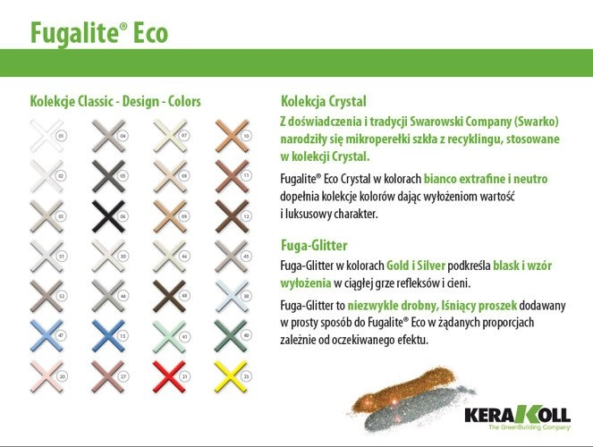 Fugalite® Eco jest płynnym materiałem ceramicznym do jednolitego spoinowania wszystkich wyłożeń ceramicznych i mozaiki szklanej. Dostępna w 4 kolekcjach kolorów, w sumie 30 barw, które tworzą przestrzeń dla kreatywności i najoryginalniejszych idei, tworząc niewątpliwe piękno pomieszczeń.