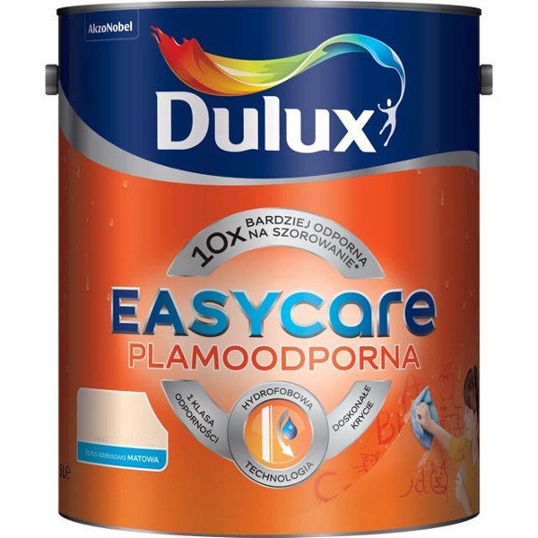 Dulux EasyCare jest plamoodporną farbą o niezwykłych hydrofobowych właściwościach. Tworzy specjalną powłokę, która odpycha wodę i wszelkie inne płynne zabrudzenia, stając się skuteczną zaporą nie pozwalającą przenikać w głąb powierzchni. Farba formuje na powierzchni matową powłokę o najwyższej odporności na plamy, a ich usuwanie staje się niezwykle proste.