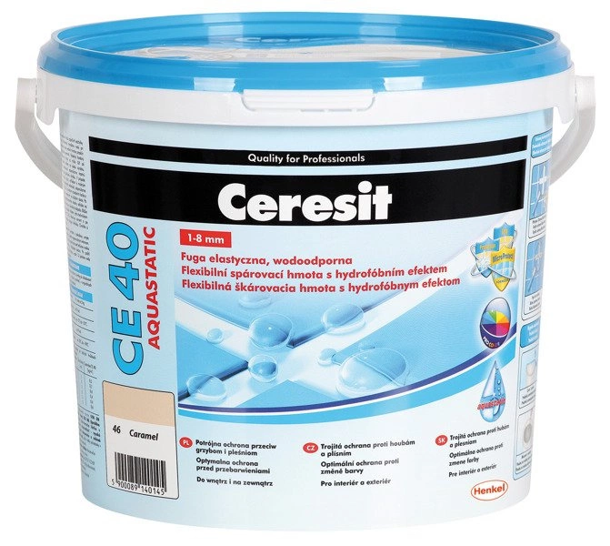 Fuga Ceresit CE 40 służy do spoinowania płytek gresowych, innych typów płytek ceramicznych, szklanych oraz kamiennych (również marmurów), zarówno na powierzchniach pionowych i poziomych. Potrójna Ochrona MicroProtect – formuła zawiera 3 specjalnie dobrane substancje czynne, które zapewniają długą i skuteczną ochronę przeciw grzybom i pleśniom. Formuła chroni nie tylko samą spoinę, lecz również przyległe do niej powierzchnie płytek (strefa inhibicji), zapewniając estetyczny wygląd okładziny ceramicznej. Efekt Aquastatic – powierzchniowe uszczelnienie spoiny (hydrofobizacja) powoduje, że krople wody utrzymują się w formie perełek na powierzchni fugi, co wydłuża znacząco działanie pleśniobójcze oraz chroni fugę przed zabrudzeniami. Zalety te umożliwiają eksploatacje spoiny w miejscach szczególnie narażonych na okresowe działanie wody np. łazienki, prysznice, kuchnie. Może być stosowana wewnątrz i na zewnątrz budynków. Szczególnie polecana, gdy płytki mocowane są na podłożach odkształcalnych: ogrzewane podłogi, płyty wiórowe i gipsowo-kartonowe. Wodoszczelność i odporność na oddziaływanie chemikaliów zapewnia stosowanie fugi Ceresit: CE 79. Dylatacje między płytkami, spoiny w narożach ścian, w połączeniach ścian z posadzką i przy urządzeniach sanitarnych należy wypełnić silikonem Ceresit CS 25.