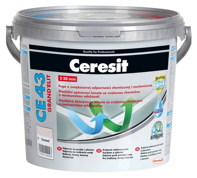 CE 43 zawiera formułę MicroProtect, dzięki której fuga jest odporna na zbrudzenia, grzyby i pleśnie oraz zapewnia estetyczny wygląd okładziny ceramicznej. Dzięki wysokiemu stopniowi hydrofobizacji spoin (efekt aquastatic) krople wody utrzymują się w formie perełek na powierzchni nie wsiąkając w jej strukturę. Zaprawa CE 43 spełnia wymagania normy PN-EN 13888:2009 – klasy CG2 WA (zaprawa do spoinowania o podwyższonych parametrach, o wysokiej odporności na ścieranie oraz zmniejszonej absorpcji wody). Umożliwia to stosowanie fugi w miejscach szczególnie narażonych na okresowe działanie wody, np.: łazienki, prysznice, kuchnie. CE 43 można stosować w basenach do spoinowania niecek 60 cm poniżej lustra wody, pomieszczeń sanitarnych, saun, holu wejściowego. Fuga przeznaczona jest do stosowania wewnątrz i na zewnątrz budynków. Szczególnie polecana, gdy płytki mocowane są na podłożach odkształcalnych: ogrzewane podłogi, płyty wiórowe i gipsowo-kartonowe, tarasy, balkony. Wodoszczelność i odporność na oddziaływania chemikaliów zapewnia stosowanie fugi Ceresit CE 79. Fuga ta powinna być stosowana również w przypadku basenów zawierających wodę o pH= 4,5 lub mniejszym, na plażach basenowych i na cokolikach 15 cm powyżej posadzki w pomieszczeniach natrysków oraz w przypadku basenów z ręcznym dozowaniem podchlorynu. Do spoinowania płytek marmurowych należy używać zaprawy Ceresit CE 40. Dylatacje między płytkami, fugi w narożach ścian, w połączeniach ścian z posadzką i przy urządzeniach sanitarnych należy wypełnić silikonem sanitarnym Ceresit CS 25 MicroProtect. W celu dodatkowego zabezpieczenia fug i okładzin ceramicznych przed zabrudzeniami, pleśnią i grzybami należy stosować silikonowy impregnat Ceresit CT 10.