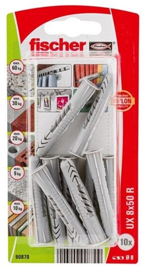 Kołki rozporowe Fischer UX 8x50 RK są idealne do montażu półek, szafek, uchwytów, listew, lamp i innych elementów wyposażenia wnętrz. Sprawdzą się w betonie, cegle, pustakach, płytach gipsowych oraz innych popularnych materiałach budowlanych.