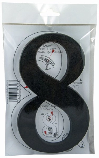 Cyfra 8 czarna o wysokości około 19 cm wykonana z lekkiego, lecz odpornego tworzywa to doskonałe rozwiązanie do oznakowania domu, mieszkania czy skrzynki pocztowej. Estetyczna, minimalistyczna forma sprawia, że numeracja prezentuje się elegancko na różnych powierzchniach. Dzięki prostemu montażowi można ją łatwo i szybko zamocować, co zwiększa komfort użytkowania i pozwala na trwałe wyeksponowanie numeru.