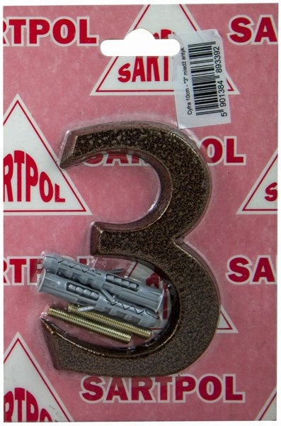 Cyfra "3" do zamontowania na drzwiach lub ścianie, która może posłużyć na przykład do oznaczenia numeru domu. Wykonana solidnie i sprzedawana z akcesoriami niezbędnymi do montażu.