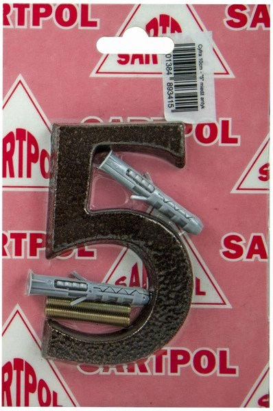 Cyfra "5" do zamontowania na drzwiach lub ścianie, która może posłużyć na przykład do oznaczenia numeru domu. Wykonana solidnie i sprzedawana z akcesoriami niezbędnymi do montażu.