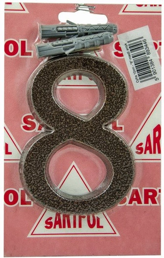 Cyfra "8" do zamontowania na drzwiach lub ścianie, która może posłużyć na przykład do oznaczenia numeru domu. Wykonana solidnie i sprzedawana z akcesoriami niezbędnymi do montażu.