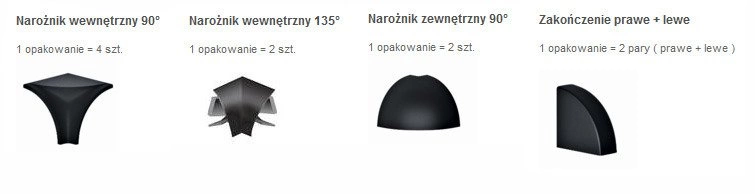 - Komplet: 12 sztuk (narożnik wewnętrzny 90° x 4, narożnik wewnętrzny 135° x 2, narożnik zewnętrzny 90° x 2, zakończenie prawe x 2, zakończenie lewe x 2)
