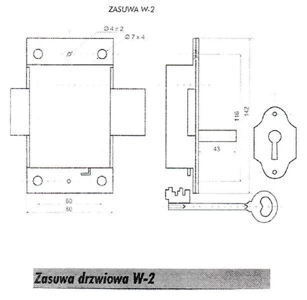 Zasuwa drzwiowa warecka W-2 posiadająca, aż 4 dwupiórowe klucze oraz zamek uniwersalny-jednoryglowy.