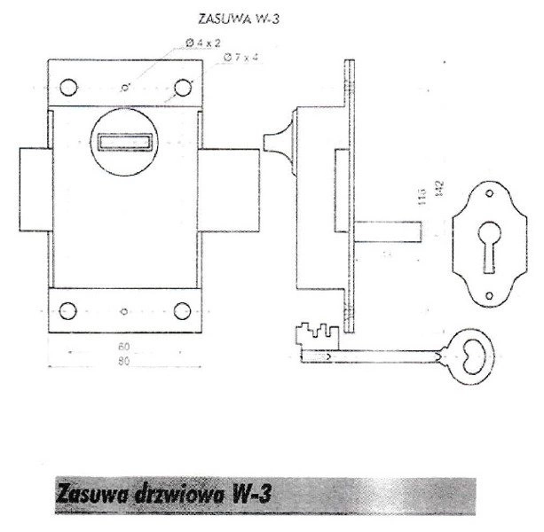 Zasuwa drzwiowa warecka W-3 posiadająca, aż 4 dwupiórowe klucze oraz zamek uniwersalny-jednoryglowy.