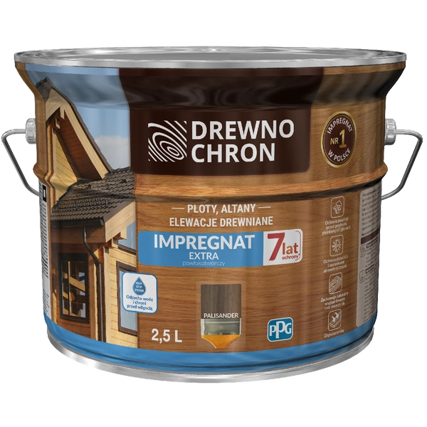 Drewnochron Extra do drewna 2,5L Palisander to nowoczesny impregnat powłokotwórczy, który zapewnia trwałą ochronę i estetyczne wykończenie drewna. Przeznaczony do malowania elementów zewnętrznych i wewnętrznych (nieprzeznaczonych na stały pobyt ludzi), skutecznie zabezpiecza drewno przed wilgocią, promieniowaniem UV, grzybami pleśniowymi i glonami. Dzięki innowacyjnej formule Aqua Stop System, powierzchnia drewna jest odporna na działanie wody – krople swobodnie spływają po powłoce, nie wnikając w strukturę drewna. Preparat nie powoduje korozji przy kontakcie z metalowymi elementami i podkreśla naturalny rysunek drewna, nadając mu szlachetny odcień palisander.