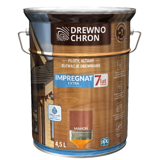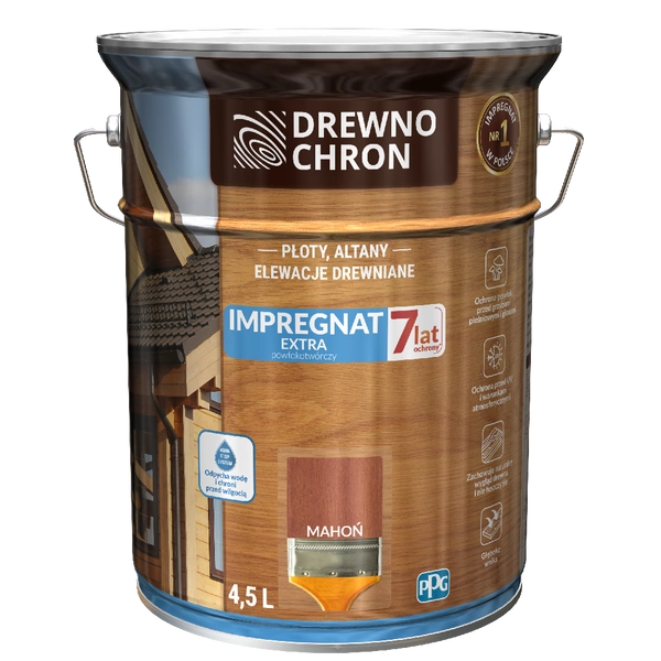 Drewnochron Extra do drewna 4,5L Mahoń doskonale sprawdza się do ochronnego i dekoracyjnego malowania elementów drewnianych na zewnątrz i wewnątrz (np. drzwi, okna, meble ogrodowe, altany, domki letniskowe, boazerie zewnętrzne, płoty, konstrukcje dachów i stropów), a także do zabezpieczania drewna przed grzybami, glonami i szkodliwym wpływem warunków atmosferycznych.