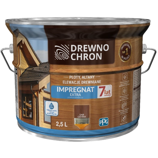 Drewnochron Extra do drewna 2,5L w kolorze Dąb ciemny to impregnat stworzony do ochronnego i dekoracyjnego malowania drewna. Jego innowacyjna formuła Aqua Stop System zapewnia trwałą ochronę przed wodą, czynnikami atmosferycznymi oraz promieniowaniem UV. Preparat tworzy powłokę odporną na grzyby pleśniowe i glony, chroniąc drewno zarówno na zewnątrz, jak i we wnętrzach nieprzeznaczonych na stały pobyt ludzi. Drewnochron Extra podkreśla naturalny rysunek drewna, nie powodując korozji przy kontakcie z metalowymi elementami. Idealnie sprawdzi się do drzwi, okien, mebli ogrodowych, altan, domków letniskowych, płotów i konstrukcji dachowych.