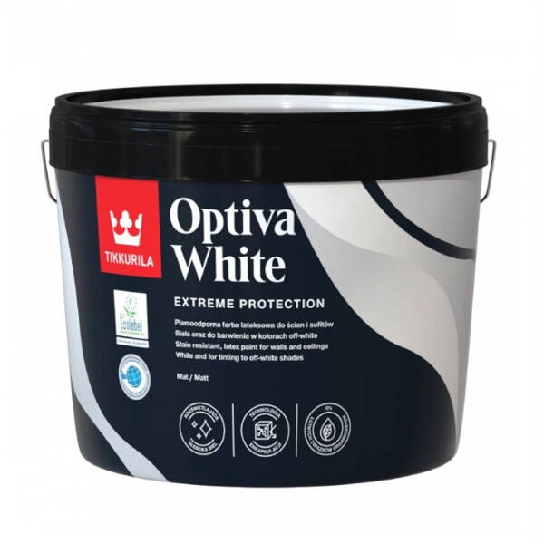 Najnowszej generacji, o wyjątkowo głębokiej bieli, wodorozcieńczalna, plamoodporna, lateksowa biała farba akrylowo-kompozytowa, specjalnie skomponowana pod kątem barwienia na kolory złamanej bieli (off-white). Farba została opracowana z wykorzystaniem nowoczesnej technologii enkapsulacji zwiększającej właściwości barierowe pomalowanej powierzchni. Przeznaczona do dekoracyjno-ochronnego malowania ścian i sufitów wewnątrz pomieszczeń mieszkalnych, biurowych i użyteczności publicznej, w tym w obiektach szkolno-wychowawczych i służby zdrowia (szkoły, przedszkola, żłobki, szpitale, przychodnie, gabinety, sale operacyjne, pomieszczenia zabiegowe, laboratoria, stacje dializ, itd.) oraz zakładach usługowych i produkcyjnych, także branży spożywczej z wykluczeniem bezpośredniego kontaktu z żywnością*. Gwarantuje piękne, matowe, jednolite wykończenie. Możliwość barwienia białej farby na 19 unikatowych odcieni off-white, wg karty kolorów: Tikkurila Optiva White