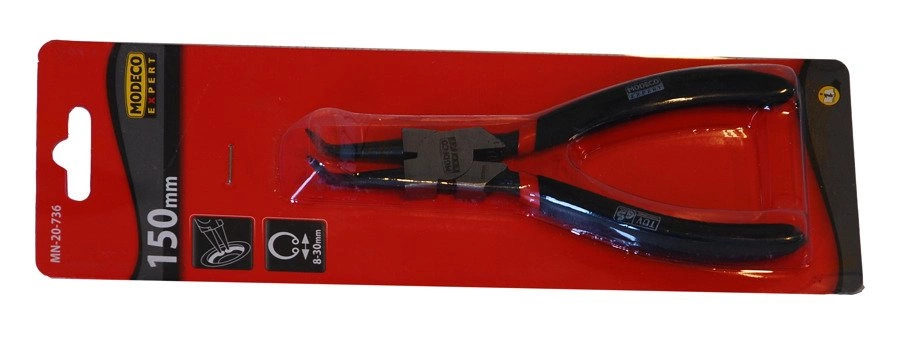 Szczypce odgięte do pierścieni Seegera wewnętrznych 150 mm MODECO to profesjonalne narzędzie przeznaczone do bezpiecznego i skutecznego montażu oraz demontażu pierścieni osadczych wewnętrznych. Dzięki ergonomicznie wyprofilowanym ramionom oraz solidnej konstrukcji, szczypce gwarantują pewny chwyt i precyzyjne działanie nawet w trudno dostępnych miejscach. Idealne dla mechaników, serwisantów i majsterkowiczów, którzy cenią sobie niezawodność oraz komfort pracy.