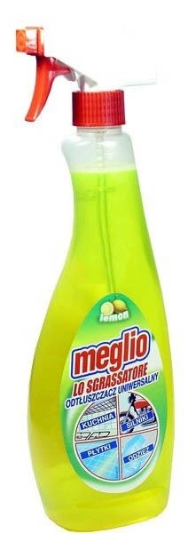 Odtłuszczacz w sprayu Meglio lemon 750ml przeznaczony jest do czyszczenia piekarników, okapów, krajalnic, talerzy, zmywarek, grilli, kominów, żaluzji, ścian zmywalnych, a także do usuwania trudnych plam z odzieży, butów sportowych, plastikowych mebli, rowerów, samochodów, motocykli, kosiarek i silników.