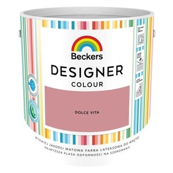 Lateksowa farba Beckers Designer przeznaczona do malowania ścian i sufitów. Jest to farba wodorozcieńczalna o wyrazistym, trwałym kolorze i matowym wykończeniu. Struktura farby przygotowana została w taki sposób by tworzyć powłokę odporną na mycie wodą z dodatkiem detergentu. Posiada dobre parametry krycia i trwały kolor. W czasie nanoszenia i schnięcia wydziela nieznaczny zapach, nie chlapie w trakcie aplikacji, pond to łatwo się ją rozprowadza na powierzchni.
