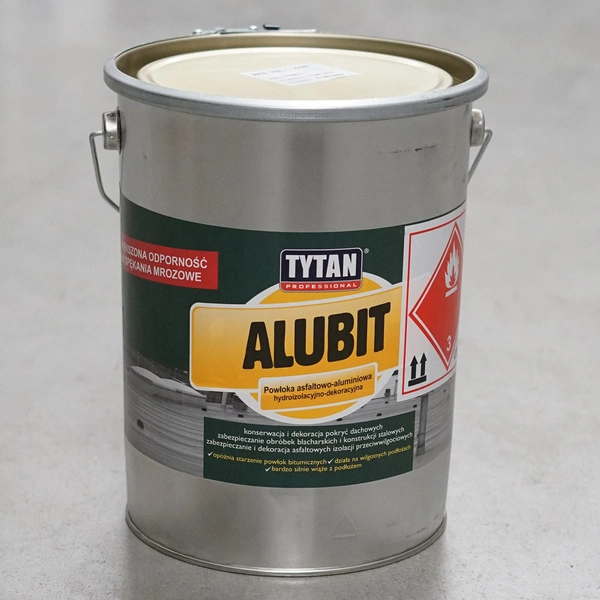 Farba asfaltowo-aluminiowa Tytan Alubit 5kg idealnie sprawdzi się do zabezpieczania dachów, blach stalowych, konstrukcji metalowych, hydroizolacji asfaltowych oraz obróbek blacharskich. Może być także stosowana do uszczelniania eternitu, zapewniając skuteczną ochronę przed wilgocią i czynnikami atmosferycznymi.