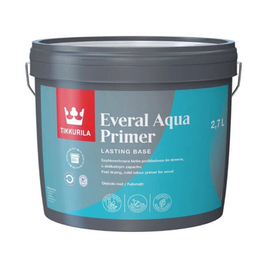 Tikkurila Everal Aqua Primer jest wysokiej klasy wodorozcieńczalną akrylową farbą podkładową. Przeznaczona jest do gruntowania wewnętrznych powierzchni drewnianych i drewnopodobnych. Grunt może być również stosowany na powierzchniach metalowych, w suchych pomieszczeniach, które nie wymagają zabezpieczenia antykorozyjnego.
