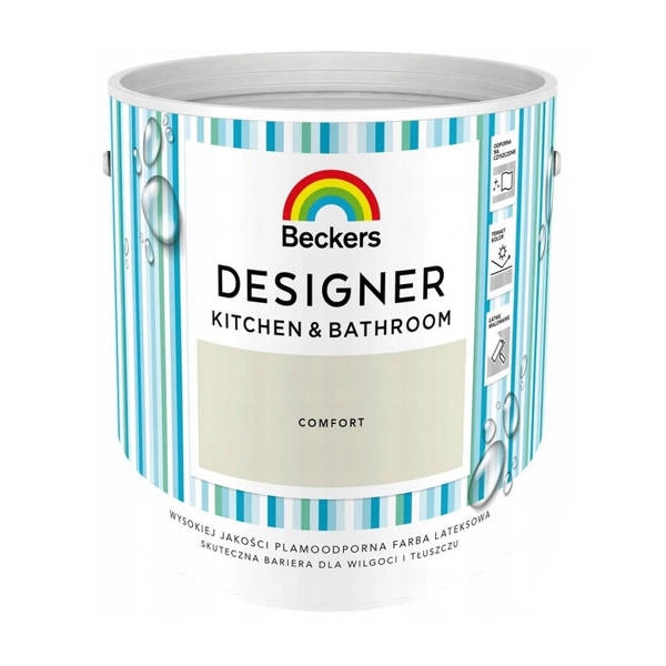 - Farba Beckers Designer Kitchen & Bathroom Comfort to farba lateksowa o najwyższej odporności na szorowanie, hydrofobowa dedykowana do pomieszczeń narażonych na działanie wilgoci oraz pary wodnej.