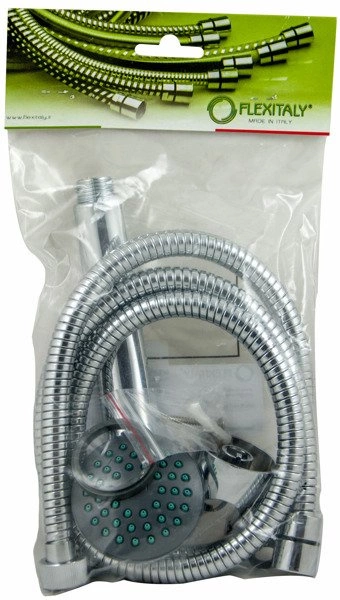 Zestaw prysznicowy zawierający wszystko co potrzebne do montażu - w jego składzie znajduje się między innymi słuchawka prysznicowa i wąż prysznicowy.