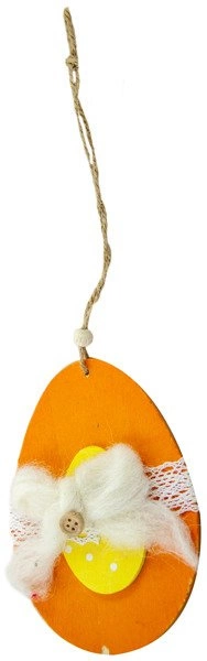 Zawieszka wykonana z drewnianej sklejki, pomalowanej na pomarańczowy kolor. Drewno uformowane zostało w kształt jajka i, dodatkowo, ozdobione białą koronką, mniejszym drewnianym jajkiem i dekorem z wełny i guzika. Jest to idealna ozdoba domu na czas Wielkanocy.
