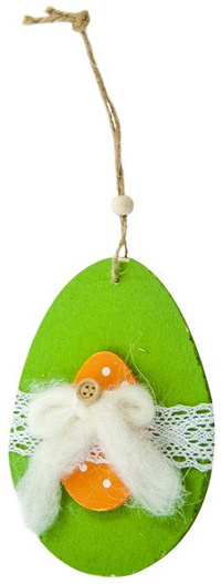 Zawieszka wykonana z drewnianej sklejki, pomalowanej na zielony kolor. Drewno uformowane zostało w kształt jajka i, dodatkowo, ozdobione białą koronką, mniejszym drewnianym jajkiem i dekorem z wełny i guzika. Jest to idealna ozdoba domu na czas Wielkanocy.