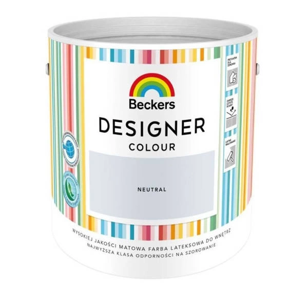 Wysokiej jakości, matowa, wodorozcieńczalna, farba lateksowa Beckers Designer Neutral polecana do dekoracyjnego malowania ścian i sufitów. Powierzchnia pomalowana farbą zyskuje piękne matowe wykończenie oraz jest odporna na szorowanie.