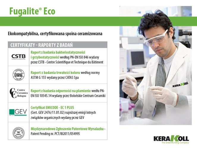 • Fugalite® Eco jest pierwszą spoiną ceramizowaną o niskim wpływie na środowisko, gwarantującą ciągłość parametrów wyłożenia ceramicznego i mozaiki szklanej.