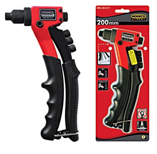 Nitownica uniwersalna do nitów zrywalnych 200 mm MODECO to niezawodne narzędzie do szybkiego i trwałego łączenia blach oraz tworzyw sztucznych. Dzięki solidnej konstrukcji i ergonomicznym uchwytom, praca z nią jest komfortowa nawet podczas długotrwałego użytkowania. Nitownica pozwala na zastosowanie różnych rodzajów nitów aluminiowych, stalowych i nierdzewnych, dzięki czemu jest wszechstronna i sprawdzi się w każdym warsztacie, garażu oraz na budowie. Prosta wymiana końcówek oraz możliwość regulacji rozwarcia rękojeści zwiększają precyzję i efektywność pracy.