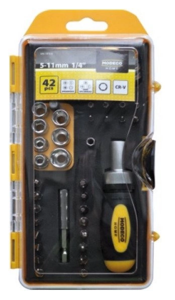 42 częściowy zestaw narzędzi Modeco MN-14-518 to uniwersalne rozwiązanie dla każdego, kto ceni sobie wygodę i kompleksowość. Zestaw obejmuje minigrzechotkę, szeroki wybór nasadek oraz grotów, które sprawdzą się zarówno podczas prac domowych, napraw samochodowych, jak i w warsztacie. Wszystkie elementy wykonane są z trwałej stali chromowo-wanadowej, gwarantującej długowieczność i niezawodność. Praktyczne, wytrzymałe pudełko z tworzywa sztucznego ułatwia przechowywanie oraz transport narzędzi, a przejrzysta organizacja sprawia, że zawsze masz wszystko pod ręką.