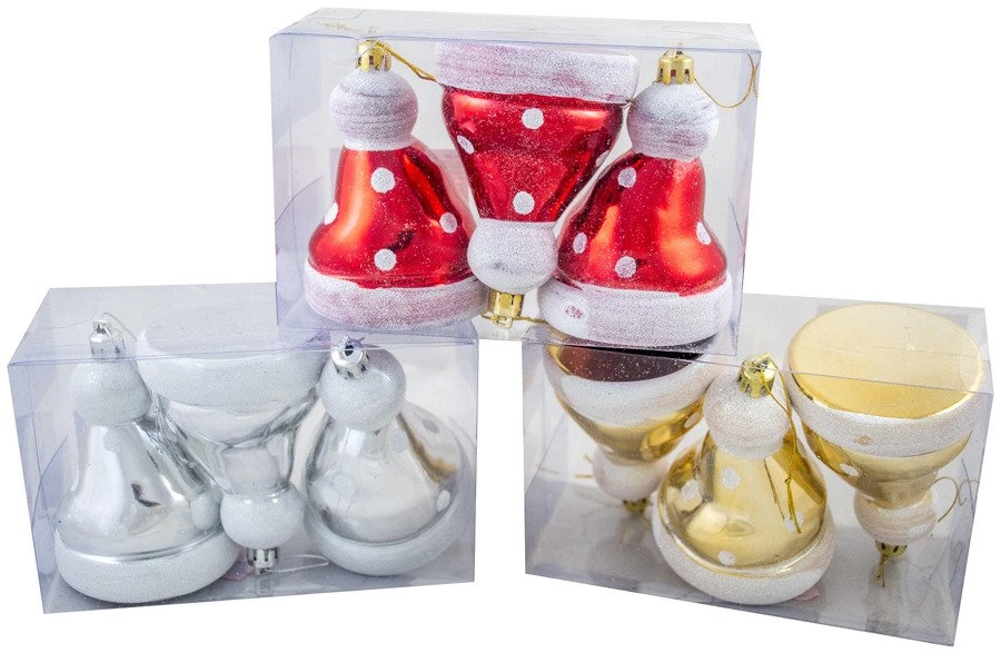 - Zestaw trzech bombek w kształcie czapki Mikołaja – każda o wysokości około 8 cm.