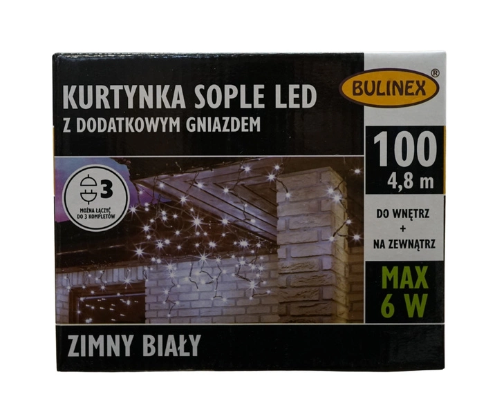 - Kurtyna zew/wew sople 100LED 4,8m biały zimny z dodatkowym gniazdem