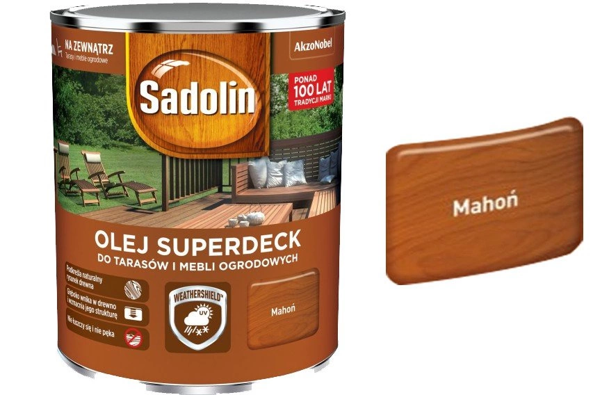 Sadolin Superdeck jest najwyższej klasy olejem posiadający w swym składzie naturalne oleje i woski, przeznaczony do malowania(konserwacji) mebli ogrodowych, tarasów ale również i innych mebli/przedmiotów wykonanych z drewna, znajdujących się na zewnątrz. Opracowany został z myślą aby zapewnić jak największe właściwości dekoracyjno-ochronne malowanej powierzchni. Technologia Weathershield- specjalnie aby zagwarantować maksymalną i skuteczną ochronę drewna przed szkodliwymi czynnikami atmosferycznymi(śnieg, deszcz, grad, zmienne temperatury powietrza). Naturalne oleje zawarte w formule produktu, pozwalają Sadolinowi głęboko przenikać w drewno, jednocześnie wzmacniając jego strukturę. Ponadto charakteryzuje się wysoką trwałością powłoki, która nie pęka i nie łuszczy się, jednocześnie gwarantując pełną ochronę powierzchni na długie lata.
