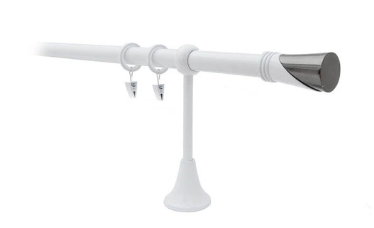 Piękny, biały karnisz, przygotowany z wytrzymałego metalu, który został pomalowany. Posiada rurę o przekroju 19 mm, zakończoną metalowymi, kulistymi końcówkami. Konstrukcję wzmocniono metalowymi wspornikami, a pierścienie kurtynowe powleczono teflonem, dla zapewnienia odpowiedniego wytłumienia dźwięku.