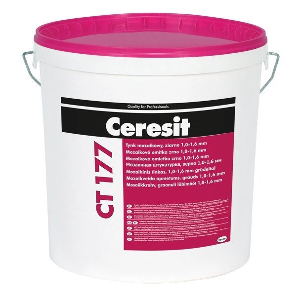 Tynk Ceresit CT 177 przygotowany został do wykonywania ozdobnych, barwnych wypraw tynkarskich na tradycyjnych tynkach, na podłożach betonowych, gipsowych oraz na płytach wiórowych, gipsowo-kartonowych itp. Spoiwem są tu transparentne żywice a wypełniaczami kolorowe żwirki kwarcowe o uziarnieniu 1,0–1,6 mm. Materiał przeznaczony jest do nakładania i wygładzania metalową pacą. Po związaniu uzyskuje się barwną wyprawę. Właściwości materiału pozwalają mostkować istniejące w podłożu włosowate rysy. CT 177 zalecany jest do stosowania na narażonych na wycieranie i zabrudzenia ścianach wewnątrz budynków, np. przy wejściach, na korytarzach, na klatkach schodowych. Na zewnątrz budynków, CT 177 zaleca się stosować na powierzchniach ulegających szybkiemu zabrudzeniu: na cokołach, balustradach, w ościeżach okien i drzwi. W przypadku intensywnych, ciemnych kolorów, stosowanie CT 177 jako warstwy elewacyjnej w systemie ociepleń budynków Ceresit Ceretherm powinno być ograniczone do małych powierzchni, np. cokołów czy detali architektonicznych.