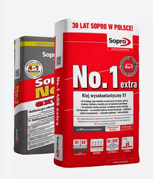 Zaprawa klejowa No. 1 Extra 22,5 kg Sopro to cementowa zaprawa klejowa o wysokiej elastyczności, wzbogacona włóknami i tworzywami sztucznymi, która zapewnia doskonałą przyczepność i trwałość. Dzięki klasie C2 TE S1 jest idealna do przyklejania płytek ceramicznych oraz niewrażliwego na przebarwienia kamienia naturalnego. Produkt łączy cztery funkcje w jednym – cienkowarstwowa, średniowarstwowa, półpłynna zaprawa oraz szpachla do warstw do 20 mm, co daje pełną elastyczność w pracy. Sprawdzi się zarówno wewnątrz, jak i na zewnątrz – na tarasach, balkonach, elewacjach, w basenach, obiektach przemysłowych i usługowych, a także przy ogrzewaniu podłogowym i ściennym. Możliwe jest również układanie płytek metodą „płytka na płytkę” na istniejących okładzinach.