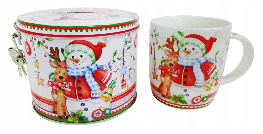 - Puszka skarbonka z bałwankiem, reniferem i kubkiem