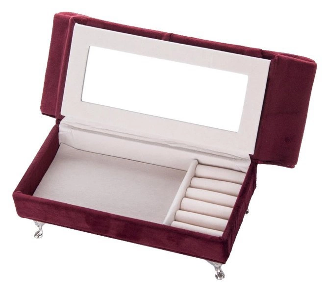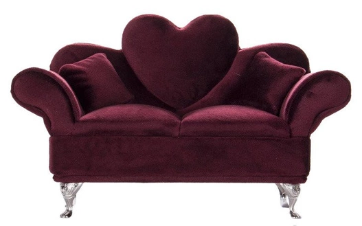 Bardzo atrakcyjna wizualnie szkatułka na biżuterię, przygotowana w formie pięknej, bordowej kanapy. Wykonana została z masy papierowej, którą zwieńczono materiałem. Kanapa posiada małe poduszeczki i duże serce w centralnym miejscu dekoracji. Poza swoją funkcją praktyczną jest też doskonałą ozdobą, która komponuje się z wnętrzem o każdym charakterze.