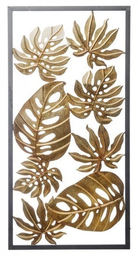 Dekoracyjny obraz wykonany z metalu, z wykorzystaniem motywu roślinnego. Przygotowany w złotym kolorze i osadzony w czarnej ramie. Stanowi bardzo atrakcyjny element dekoracyjny, który może być eksponowany samodzielnie, lub jako część większej kompozycji ozdobnej.