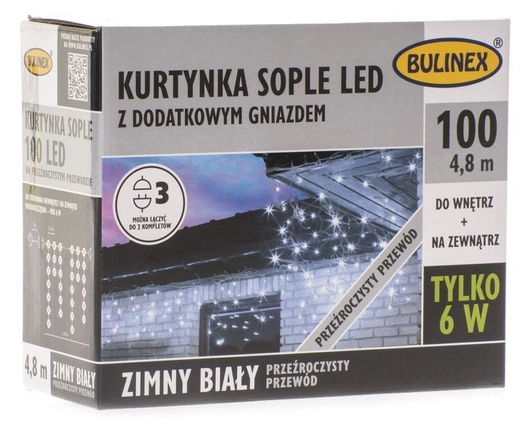 - Delikatne sople LED rozmieszczone na długości 4,8 metra, tworzą efekt zimowej kurtyny świetlnej.