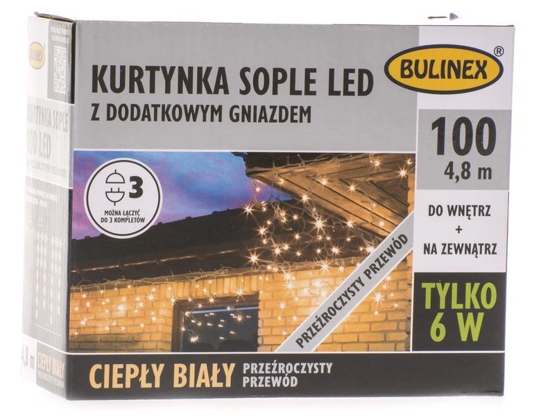 Kurtyna sople LED przygotowane w wersji klasycznej, do zastosowania wewnątrz i na zewnątrz budynku. Pozwala na stworzenie magicznej atmosfery świąt Bożego Narodzenia, wprowadzając ten wyjątkowy nastrój do całego otoczenia. Oświetlenie przygotowano w wersji białej ciepłej, osadzone na transparentnym przewodzie elektrycznym. Posiadają dodatkowe gniazdo i można łączyć do 3 kompletów ze sobą.