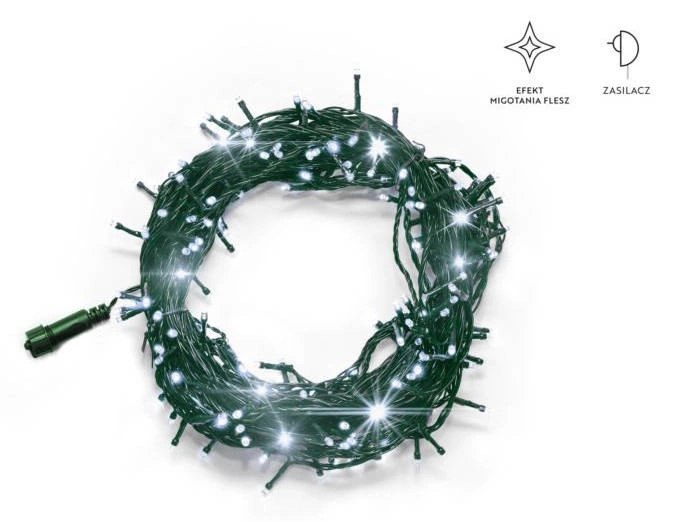 Lampki zew/wew 100 LED 9,9m Flesz zimny / biały zimny to subtelna girlanda świetlna, która dodaje przestrzeni lekkości i świątecznego uroku. Chłodny, krystaliczny odcień światła pięknie podkreśla zimowe dekoracje, a dyskretny, zielony przewód wtapia się w gałązki, stroiki i ogrodową roślinność. Delikatny efekt flesza ożywia aranżację, tworząc migotliwy rytm – idealny do dekoracji świątecznych, nastrojowych kolacji czy spokojnych wieczorów na tarasie.